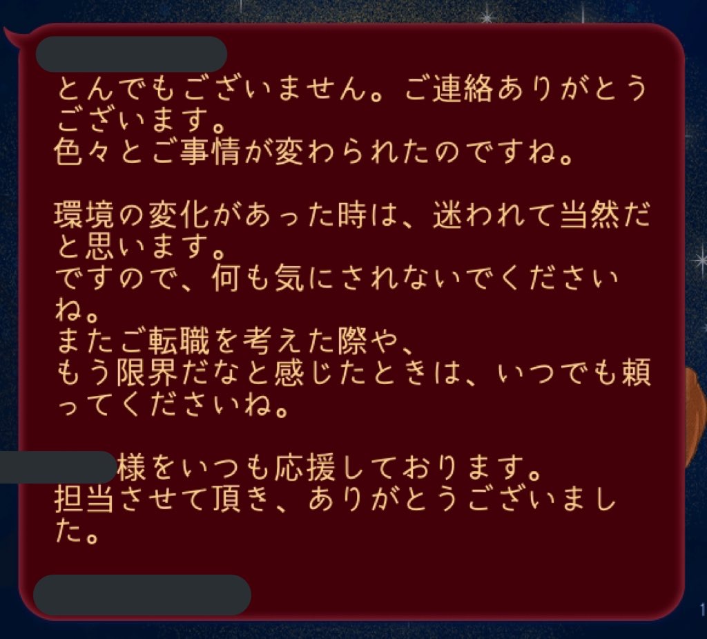 履歴書添削や面接対策から、面接調整まで丁寧にサポートしていただき、貴重なお時間を頂いたこと、感謝とお詫びを申し上げます。